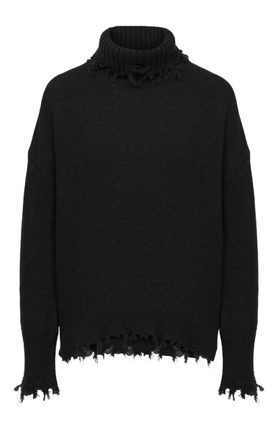Черный свитер с длинными рукавами и высоким воротником выполнен из мягкой кашемировой пряжи с шелковистыми невесомыми волокнами. По краям — бахрома, придающая модели слегка небрежный вид любимой вещи, которую долго и с удовольствием носили. Нам нравится сочетать с синими джинсами, бежевым тренчем и коричневыми ботильонами.