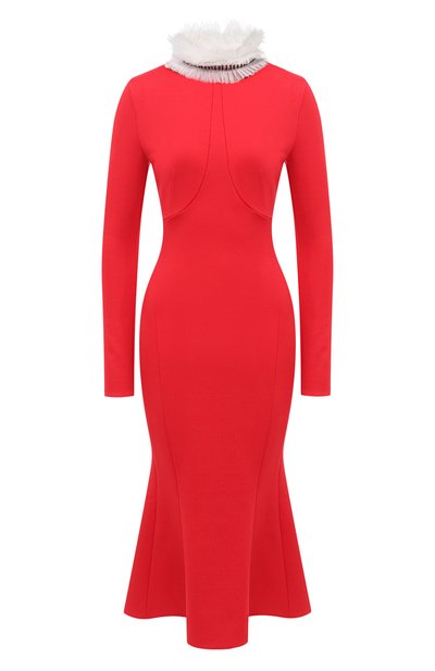 Платье насыщенного алого оттенка — простой способ ввести яркий цвет в гардероб. За счет съемного воротника-стойки, декорированного перьями страуса, модель поможет создать коктейльный наряд. Для пошива изделия из осенне-зимней коллекции Светлана Тегин выбрала мягкое шерстяное джерси, которое комфортно облегает фигуру.