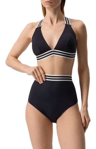 Плавки-бикини из линии Energie Nautique сшили из материала Lycra Sport с защитой от УФ-излучения UPF 50. Модель с заниженной посадкой дополнили эластичным поясом в полоску с добавлением люрекса.