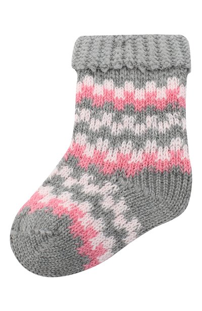 Для изготовления носков использовали приятную на ощупь пряжу. Хлопок в ее составе позволяет коже дышать, кашемир сделал модель мягче и теплее, а полиамид не дает ей деформироваться после частых стирок. В серое полотно вплели нити двух оттенков розового, сложив геометрический узор. Широкий эластичный отворот удерживает аксессуар на ноге, но не пережимает сосуды.
