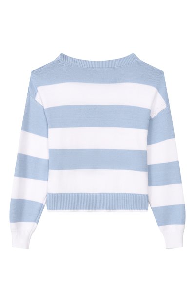 Голубой пуловер с круглым вырезом связали из мягкого нежного кашемира, который греет в восемь раз лучше шерсти, но при этом не колется и почти не ощущается на теле. Спереди модель украшена интарсионной надписью «Lucky me». На левом плече — планка с пуговицами.