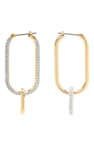 Серьги создали в лучших традициях супрематистов. В геометрическую композицию заключили крупные и небольшие прямоугольные детали. Асимметрию комплекту задает кристальное паве. Миниатюрные прозрачные камни расположили и на основании, и на съемной подвеске, но по одному элементу в аксессуаре. От потертостей ювелирный сплав защищают родиевое и золотое напыления.