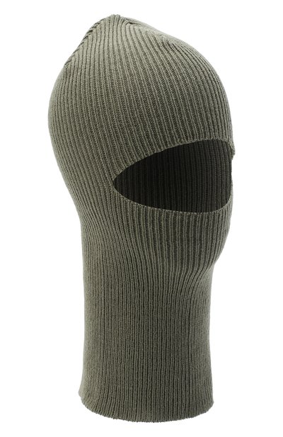 Зеленый однотонный шлем с узким вырезом для лица выполнен из тонкого полушерстяного трикотажа с шелковистой текстурой. Легкая эластичная балаклава без декора почти не ощущается на голове и в сложенном виде помещается даже в карман.