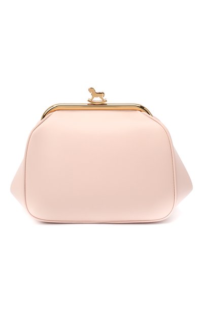 В осенне-зимнюю коллекцию Ульяна Сергеенко включила сумку нежно-розового оттенка, как у клубничной пастилы. Аксессуар из матовой гладкой кожи закрывается рамочным замком с защелкой в форме эмблемы марки ‒ игрушечной лошадки. Плечевой ремень-цепочку можно снять и носить модель как клатч.