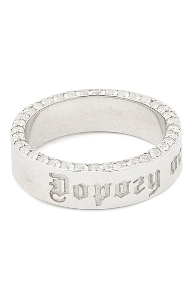 Кольцо с жизнеутверждающей гравировкой-надписью «Дорогу осилит идущий» выполнено из ювелирного сплава с серебристым родиевым покрытием. Его холодный блеск поддерживают миниатюрные сверкающие кристаллы, которыми инкрустирован ободок украшения.