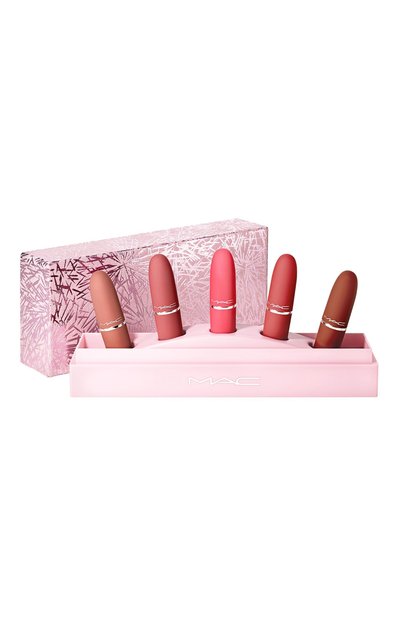 Лимитированный подарочный набор включает пять оттенков знаковой для бренда помады Powder Kiss Lipstick: приглушенный красно-розовый Stay Curious, насыщенный Fall in Love с пурпурным подтоном, холодный красный Werk, Werk, Werk, кирпичный Devoted to Chili и персиковый Mull it Over. Их главное достоинство — сочетание матового покрытия с эффектом мягкого расфокуса и невесомой бальзамной текстуры, увлажняющей губы.