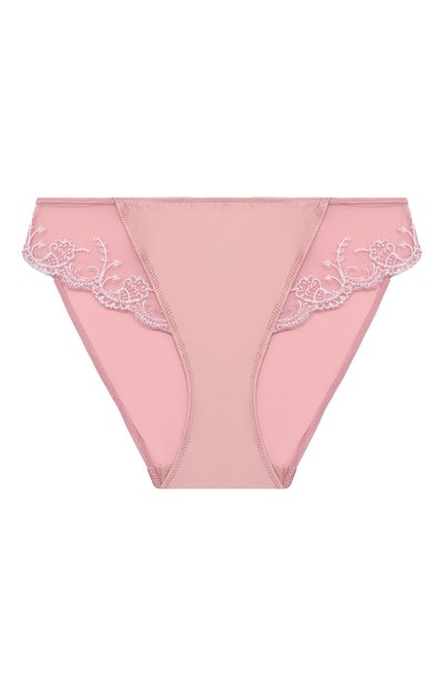 Для изготовления светло-розовых слипов мастера марки использовали тонкий атлас на основе шелка. В состав материала добавили эластан, поэтому изделие немного тянется и комфортно облегает фигуру. Трусы украсили вставками по бокам и сзади, выполненными из полупрозрачного тюля с цветочной вышивкой.
