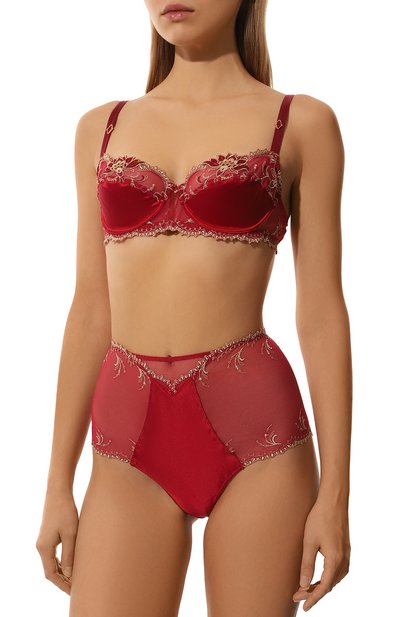 Мастера марки использовали для пошива трусов комбинацию практически невесомого шелкового атласа и тонкого полупрозрачного тюля, объединив разные по фактуре материалы насыщенным красным цветом. Проймы и треугольную вставку сзади акцентировали объемной цветочной вышивкой.
