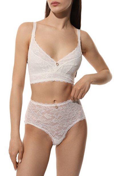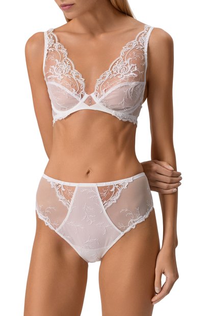 Трусы из линии Splendeur Soie сшили из атласного джерси с добавлением шелка. Слипы с хлопковой ластовицей дополнили кружевными тюлевыми вставками по бокам и сзади.