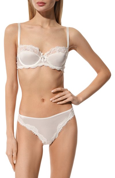 Линия, в которую входят эти стринги, не зря называется Splendeur Soie — «Шелковое великолепие»: перед модели выполнен из шелкового атласа. Нежный материал инкрустировали тюлем с изысканной цветочной вышивкой. Фестончатый узорный пояс мягко облегает бедра, а хлопковая ластовица обеспечивает комфорт в течение дня.