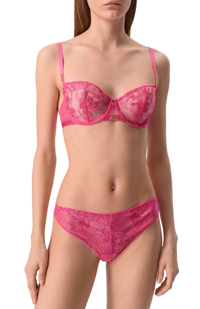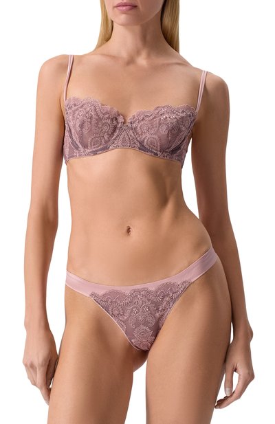 Стринги из линии Splendeur Soie сшили из комбинации атласного шелка, тюля и цветочного кружева. Трусы с низкой посадкой дополнили хлопковой ластовицей.