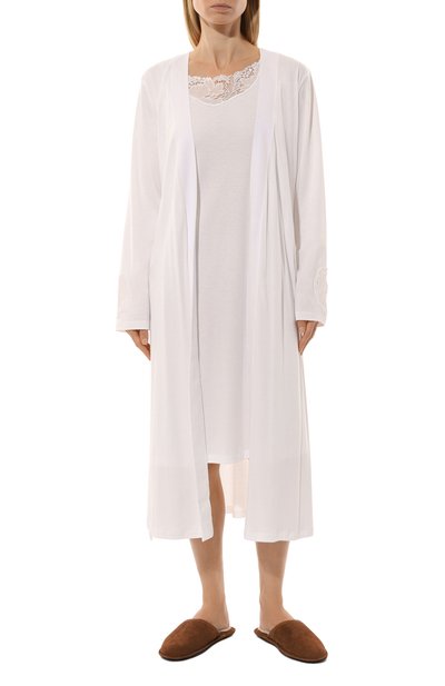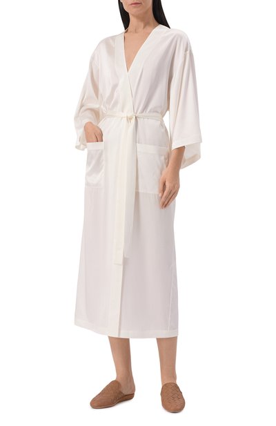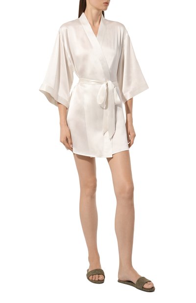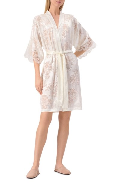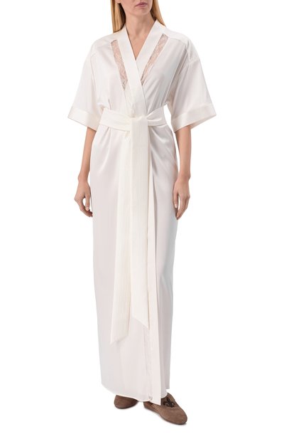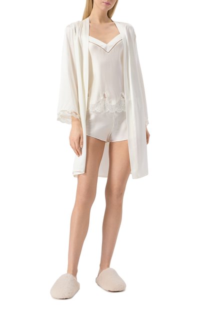 Молочно-белый халат с запахом и широким поясом-лентой сшит из струящегося шелкового атласа. Приятный на ощупь материал нежно скользит по коже, а изделия из него почти не ощущаются на теле. Укороченные рукава пеньюара отделаны воздушным ажурным кружевом кале.