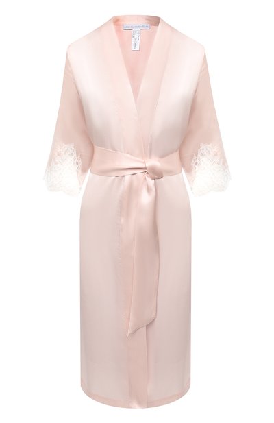 Короткий бледно-розовый халат с запахом сшили из гладкого шелкового атласа. Изделие из такого материала мягко скользит по коже и почти не ощущается на теле, а посадку на талии удобно регулировать широким длинным поясом. Рукава декорировали фигурными вставками из ажурного цветочного кружева кале ручной работы.