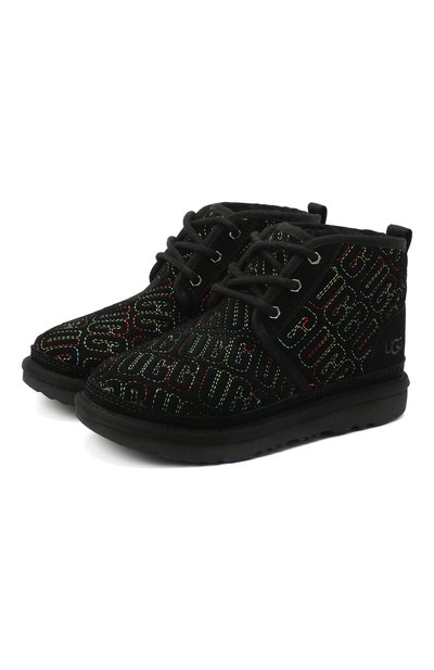 Черные ботинки с радужным узором сшили из непромокаемой нежной замши, которая легко адаптируется под форму стопы, а для утеплителя выбрали шерсть UGGpure. Она легче и нежнее обычной, но также хорошо сохраняет комфортную для ног температуру вне зависимости от погодных условий. Легкая амортизирующая подошва Treadlite с протектором обеспечивает сцепление с обледенелой и мокрой дорогой.