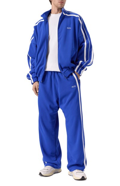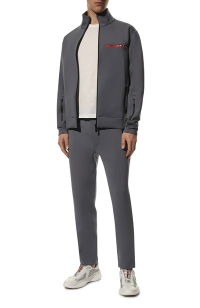 Ярко-синяя олимпийка станет достойной альтернативой легкой куртке. Для пошива модели Миучча Прада выбрала мягкий прочный трикотаж из переработанного полиэфирного волокна. Одежда из такого материала хорошо тянется, не сковывая движения, и долго сохраняет изначальный вид. Изделие с двумя парами карманов (по бокам и на рукавах) декорировали знаковой для линии Linea Rossa алой вставкой с логотипом.
