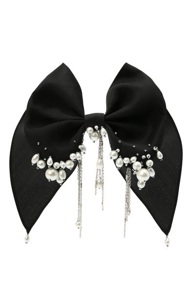 Несмотря на универсальный черный оттенок, крупная заколка-бант автоматически поднимет на новый уровень даже самый простой образ. Дизайнеры бренда украсили аксессуар из мягкого шелковистого текстиля жемчужными бусинами разной формы и размера, а также тонкими ниспадающими цепочками, которые особенно эффектно выглядят в движении.