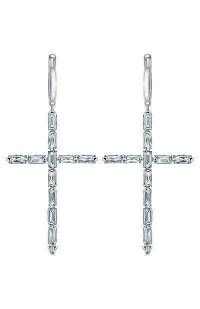 Серьги выполнили из полированного серебра 925 пробы. Аксессуар с основанием-кольцом дополнили подвеской в виде креста, украшенной голубыми топазами багетной огранки.