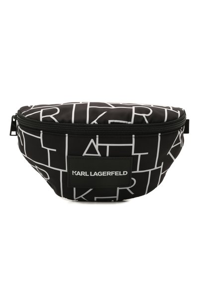 Небольшую поясную сумку с регулируемым по длине широким ремнем выполнили из прочного непромокаемого полиэстера с контрастны м белым принтом, в котором зашифровано имя Карла Лагерфельда. Переднюю панель декорировали кожаным патчем с логотипом марки. В аксессуар поместятся смартфон, носовой платок и ключи.