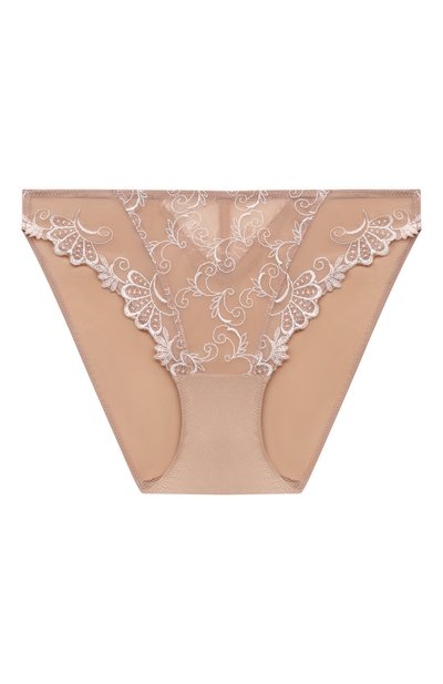 Слипы из прозрачного тюля правильного бежевого оттенка буквально сливаются с кожей, поэтому белая растительная вышивка кажется рисунком, нанесенным прямо на тело. Изящный узор обрамляет и треугольную вставку сзади, которая контрастирует с гладким эластичным сатином без декора.