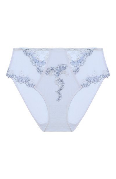 Голубые слипы с высокой посадкой мастера марки выполнили из полупрозрачного тюля и нежного текстиля с атласным блеском. Трусы из таких тонких, но при этом прочных материалов с добавлением эластана комфортно облегает фигуру. Спереди модель украсили нашивками из гипюра с растительным узором.