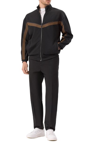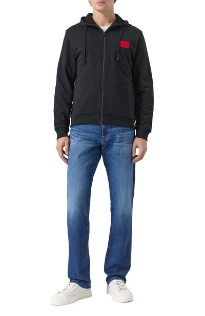 В черной толстовке из весенне-летней коллекции все элементы работают на комфорт, а основной вклад вносит материал. Для изготовления модели мастера марки, основанной Хуго Фердинандом Боссом, использовали плотный хлопковый футер с характерной фактурной изнанкой. Текстиль особенно мягкий и согревающий, он обес печит комфорт прохладным летним вечером. Изделие украсили только красным брендированным патчем.
