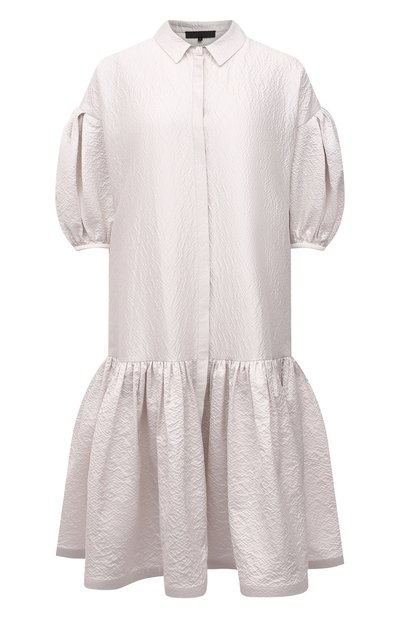 Свободное светло-серое платье из коллекции сезона весна-лето особенно эффектно выглядит в движении. Все дело в слегка жатой фактуре мягкой шелковистой ткани, которая деликатно переливается в лучах света. Материал красиво драпируется, поэтому рукава и широкая оборка на подоле останутся объемными.