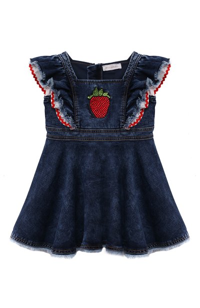 Синее платье без рукавов сшили из мягкого денима с потертостями. В чистом виде такой материал плохо тянется, поэтому в состав включили стрейчевые волокна. Модель с длинной молнией сзади украсили белой вставкой из кружева с цветочным мотивом и патчем в виде клубники с мерцающими стразами.