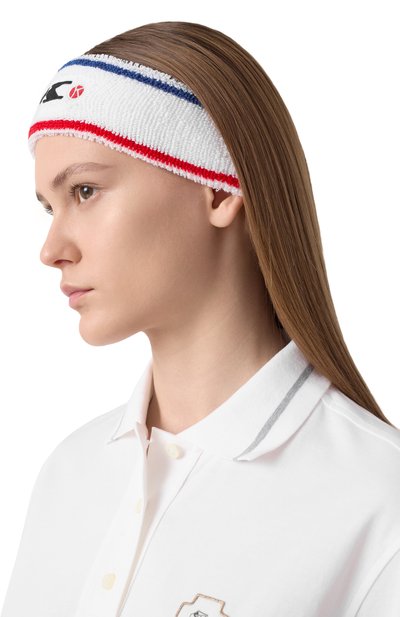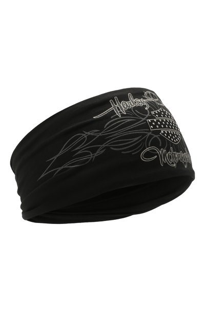 Черная повязка громко заявляет о своей принадлежности бренду за счет крупного принта, подчеркнутого круглыми заклепками. Мастера марки выполнили модель из мягкого приятного на ощупь полиэстера. Благодаря вплетению тонких эластичных нитей материал слегка тянется, поэтому аксессуар комфортно облегает голову.
