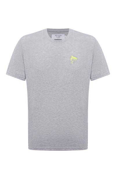 В весенне-летнюю коллекцию вошла серая меланжевая футболка с короткими рукавами. Спереди модель декорировали кислотно-желтым принтом в виде акулы. Дл я пошива изделия использовали мягкий хлопок джерси, который хорошо пропускает воздух и слегка тянется, поэтому вещь не сковывает движения.