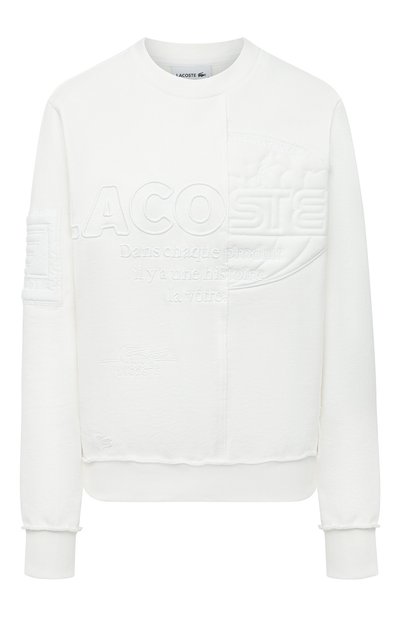 Белоснежный свитшот вошел в весенне-летнюю коллекцию марки, основанной Рене Лакостом. Для пошива модели мастера бренда использовали мягкий хлопковый трикотаж, который поддерживает оптимальную температуру и слегка тянется, поэтому вещь не сковывает движения. На правом рукаве изделие декорировали стеганой текстильной вставкой, спереди – вышитой нитью в тон эмблемой в виде аллигатора и крупным логотипом, выполненным в смешанной технике.