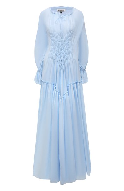 Длинная небесно-голубая туника из весенне-летней коллекции подойдет, чтобы отметить очередной температурный рекорд. За комфорт в жару отвечает тонкий нежный хлопок, который не мешает воздуху циркулировать и не перегревает кожу. Благодаря свободному крою вещь драпируется объемными мягкими складками, а еще женственнее ее делают оборки на манжетах длинных рукавов и сложносочиненный стеганый мотив спереди.