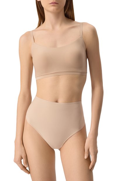 Для пошива бежевых стрингов использовали мягкую шелковистую ми крофибру с добавлением волокон эластана. Тонкий гладкий материал не натирает кожу и хорошо тянется, не сковывая движения. Модель с плоскими швами и краями, обработанными лазером, не будет заметна под облегающей одеждой.