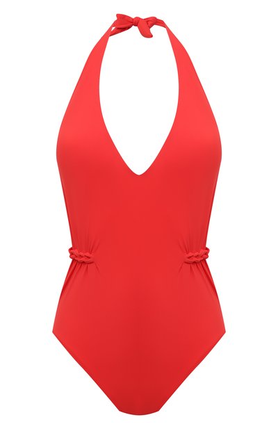Красный слитный купальник с глубоким V-образным вырезом и открытой спиной поможет заявить о себе как на пляже, так и в бассейне. Яркая модель, украшенная по бокам драпировками и косами, сшита из быстросохнущего гладкого джерси, которое не боится соленой и хлорированной воды и не выцветает под прямыми солнечными лучами.