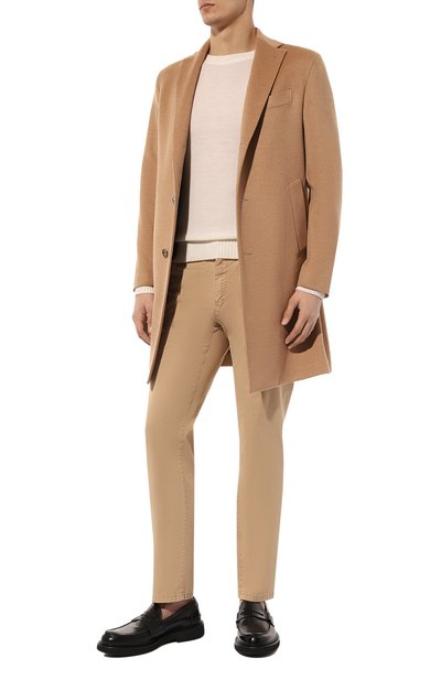 Зауженные бежевые брюки из эластичного гладкого хлопка легко впишутся в повседневный гардероб. Однотонная модель с классической посадкой, врезными карманами и стрелками, визуально вытягивающими силуэт, вошла в коллекцию сезона осень-зима. Нам нравится сочетать с черным поло и белыми кедами.