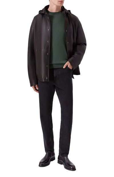 Куртку из гладкой кожи ягненка можно вывернуть и носить нейлоновой стороной. Двустороннюю модель с регулируемым капюшоном и шестью карманами (по три с каждой стороны) дополнили эластичными манжетами и кулиской по краю низа.