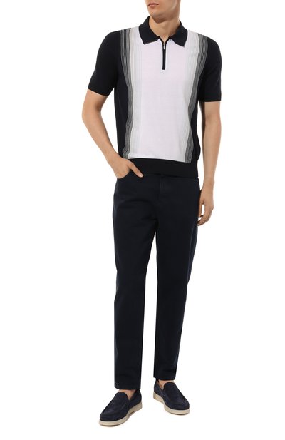 Поло с абстрактным принтом застегивается молнией. Модель сшили из мягкого трикотажа на основе нейлона. Воротник и манжеты сделали контрастными, дополнительно украсив полосами.