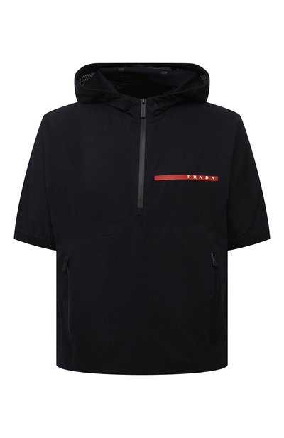 Черная куртка с короткими рукавами, капюшоном и врезными карманами, застегивающимися на прорезиненные молнии, вошла в осенне-зимнюю коллекцию. Легкая модель сшита из немнущейся инновационной ткани, которая растягивается в четырех направлениях. На груди — логотип марки.
