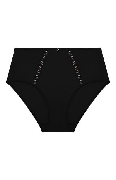 Для пошива черных слипов с высокой посадкой использовали гладкую эластичную лайкру, шелковистый материал с шевронным узором и полупрозрачный тюль. Трусы комфортно облегают бедра, не сковывая движения, а плоские края не сдавливают и не натирают кожу. Спереди модель украсили диагональными ажурными вставками и миниатюрной золотистой подвеской в виде эмблемы.