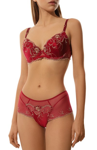 В красных трусах-шортах будет комфортно в течение дня. На это работают материалы. Модель скомбинировали из т онкого шелковистого текстиля и нежного цветочного кружева, которое мастера марки выполнили вручную. Изделие дополнили мягкой хлопковой ластовицей.