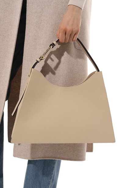 Бежевая сумка Re Edition — новый взгляд Миуччи Прады на архивную модель, которая впервые появилась в 2005 году. Новую версию выполнили из инновационного нейлона, который получили за счет переработки и очистки собранного в океане пластика, рыболовных сетей и текстильных отходов. Аксессуар с короткой широкой ручкой из плетеной ленты декорировали фирменной треугольной накладкой с логотипом бренда.