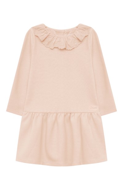 Свободное платье нежного розового оттенка сшили из тонкого миланского трикотажа. Эластичный материал выполнили из гладких волокон модала, придающих ему шелковистый блеск, и прочного гипоаллергенного хлопка, отвечающего за комфорт. Широкую оборку на круглой горловине украсили неброской цветочной вышивкой, созданной нитями в тон.