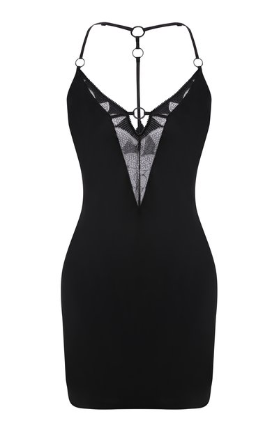 Черная сорочка ставит знак равенства между красотой и комфортом. За первое в модели отвечают полупрозрачные кружевные вставки, подчеркивающие спину и декольте, а за второе — материал. Для пошива изделия мастера марки использовали легкий струящийся шелк, который почти не ощущается на теле. Посадку можно регулировать бретелями у шеи.