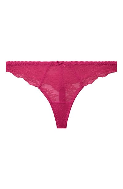 Стринги сочного оттенка фуксии почти ничего не весят и не ощущаются на теле. Для создания трусов мастера марки использовали нежное кружево с изысканным цветочным мотивом, вышитым по полупрозрачному тюлю. Модель с фестончатыми краями и узким эластичным поясом украсили миниатюрными атласными бантами спереди и сзади.