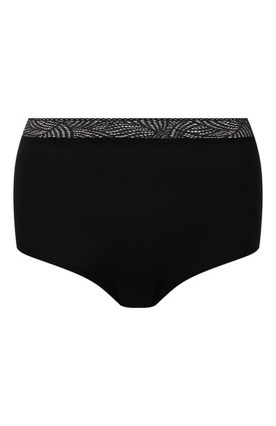 Эти бесшовные черные слипы с высокой посадкой почти не ощущаются на теле. Все дело в тончайшем эластичном трикотаже Soft Stretch, который подстраивается под особенности фигуры и пропускает воздух не хуже хлопка. Из такого же нежного материала выполнен широкий пояс с ажурным узором.