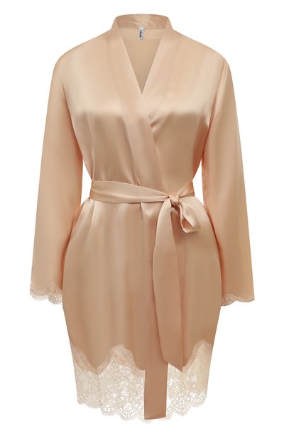 Для пошива халата дизайнеры марки выбрали нежный струящийся шелковый атлас, который особенно приятен на ощупь. Из такой же тонкой ткани выполнили широкий пояс-ленту, не дающий модели распахнуться, а края подчеркнули кре мовым ажурным кружевом с фестонами.