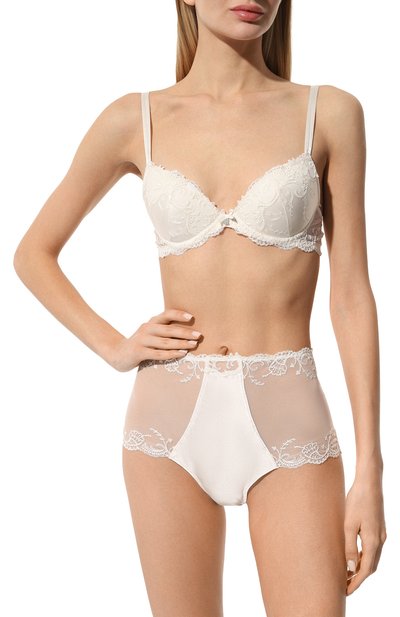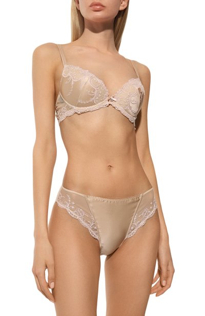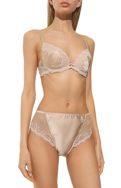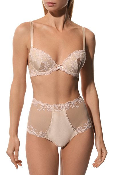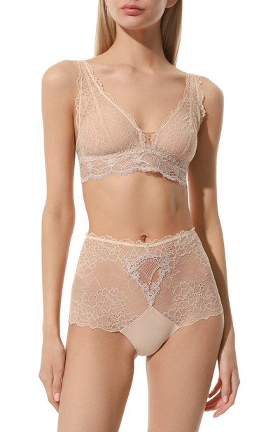 При пошиве бежевых трусов-шортов тонкое воздушное кружево кале объединили с мягким эластичным джерси, дополнив сзади треугольной вставкой из полупрозрачного тюля. Модель с фестончатым поясом и плоскими швами комфортно садится по фигуре и остается незаметной под одеждой.