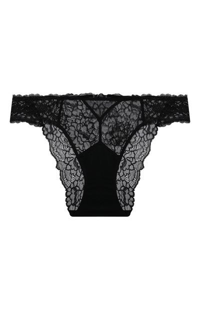 Мастера марки сшили черные слипы из тонкого полупрозрачного кружева кале с ажурным цветочным мотивом. В состав материала вплели эластичные волокна, поэтому трусы комфортно облегают тело и не сковывают движения. Благодаря фигурным краям с бесшовной отделкой белье не натирает и не впивается в кожу.