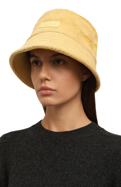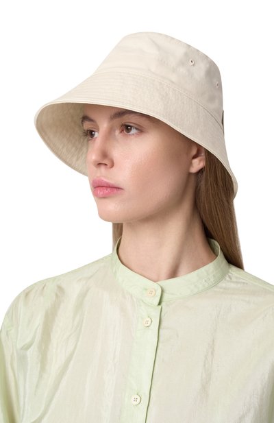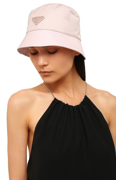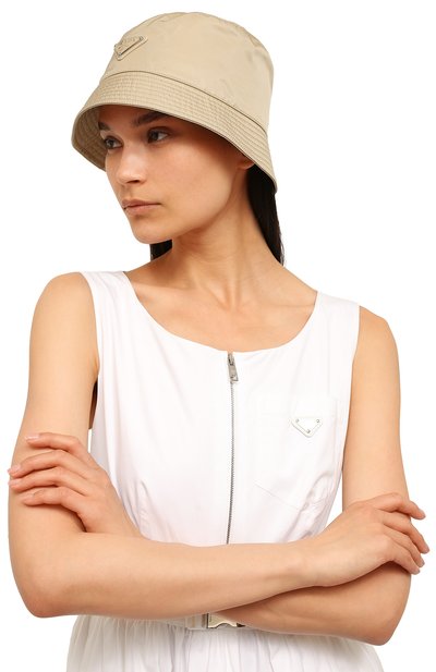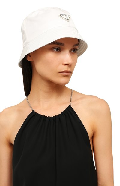 Бледно-серую панаму с узкими покатыми полями сшили из прочного непромокаемого материала Re-Nylon. Для его производства использовали переработанные рыболовные сети, текстильные отходы и выловленный в океане пластик, что помогло снизить вредное воздействие на природу. Модель декорировали знаковой треугольной пластиной с логотипом.