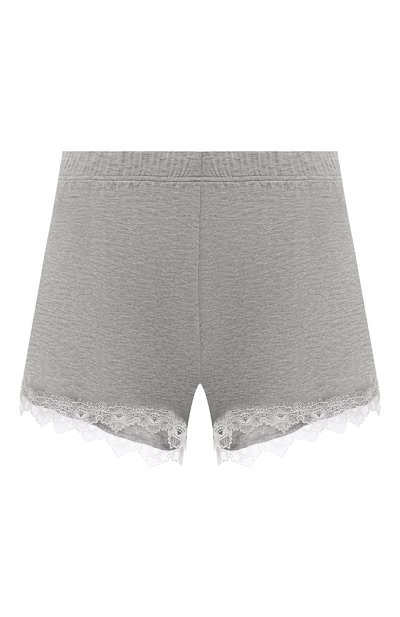 Мастера марки сшили серые меланжевые шорты из тонкого джерси на основе микромодала с добавлением стрейчевых волокон. Этот легкий, но прочный материал из волокон буковой древесины не хуже хлопка пропускает воздух, впитывает и отводит влагу, поэтому в изделии будет исключительно комфортно во время сна и домашнего отдыха. Модель с эластичным поясом декорировали ажурным белым кружевом ручной работы.