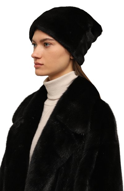 Для производства черной шапки использовали мягкий шелковистый мех норки. Вначале из шкурок нарезают равномерно узкие полосы, а затем мастера марки искусно переплетают их вручную, формируя вязаное полотно. За счет такого способа аксессуар особенно легкий, но сохраняет тепло ничуть не хуже обычных моделей.